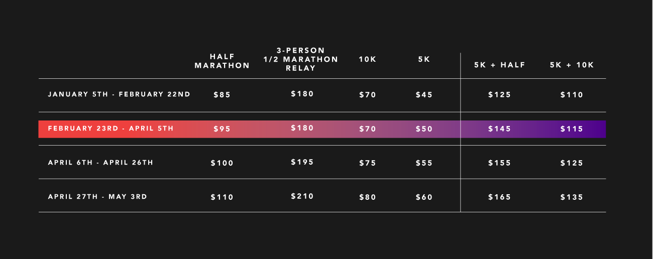 If you’re just the right amount of courageous and crazy, we’ve got the perfect challenge for you. Back by popular demand, our “Double” pairs our Saturday evening 5K with either the Half Marathon or 10K Event on Sunday morning. Those who make it across the finish line of both races receive an extra piece of swag and a whole lot of bragging rights.
