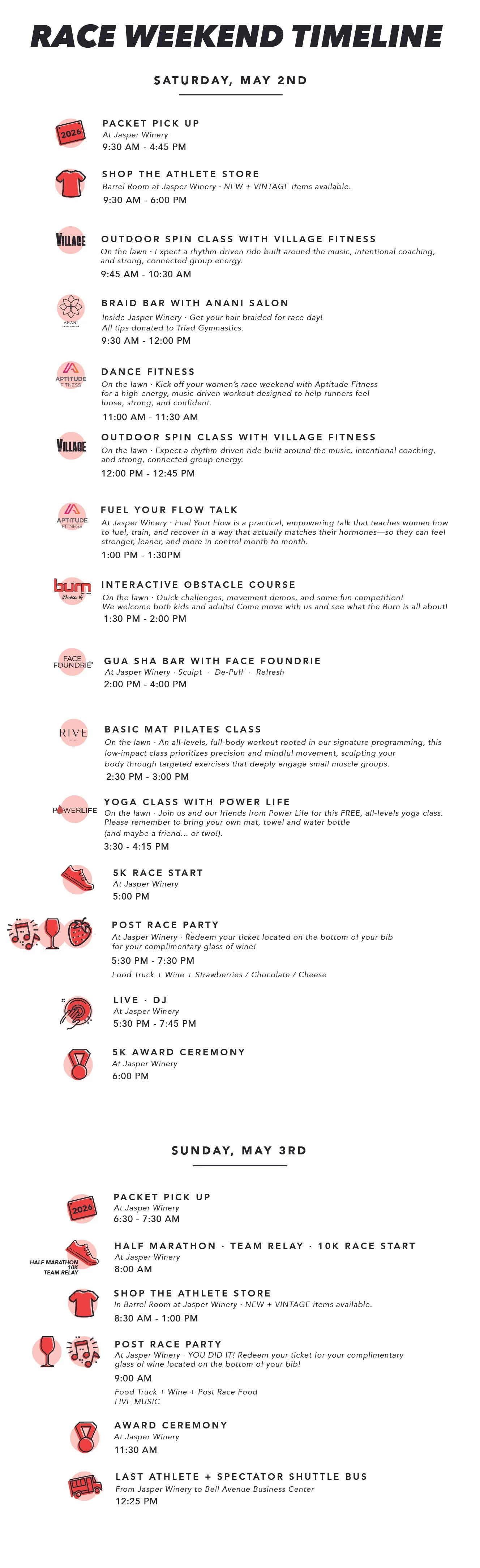 Our team relay is a perfect excuse to get together with your girlfriends and work together to take down the challenge of a half marathon. Each team member will run 4-5 miles of our half marathon course before 'passing the baton' at our relay exchange zones. Relay teams will be given special parking near Jasper Winery to ensure they're able to finish together before raising a glass. Each team member receives full half marathon swag.